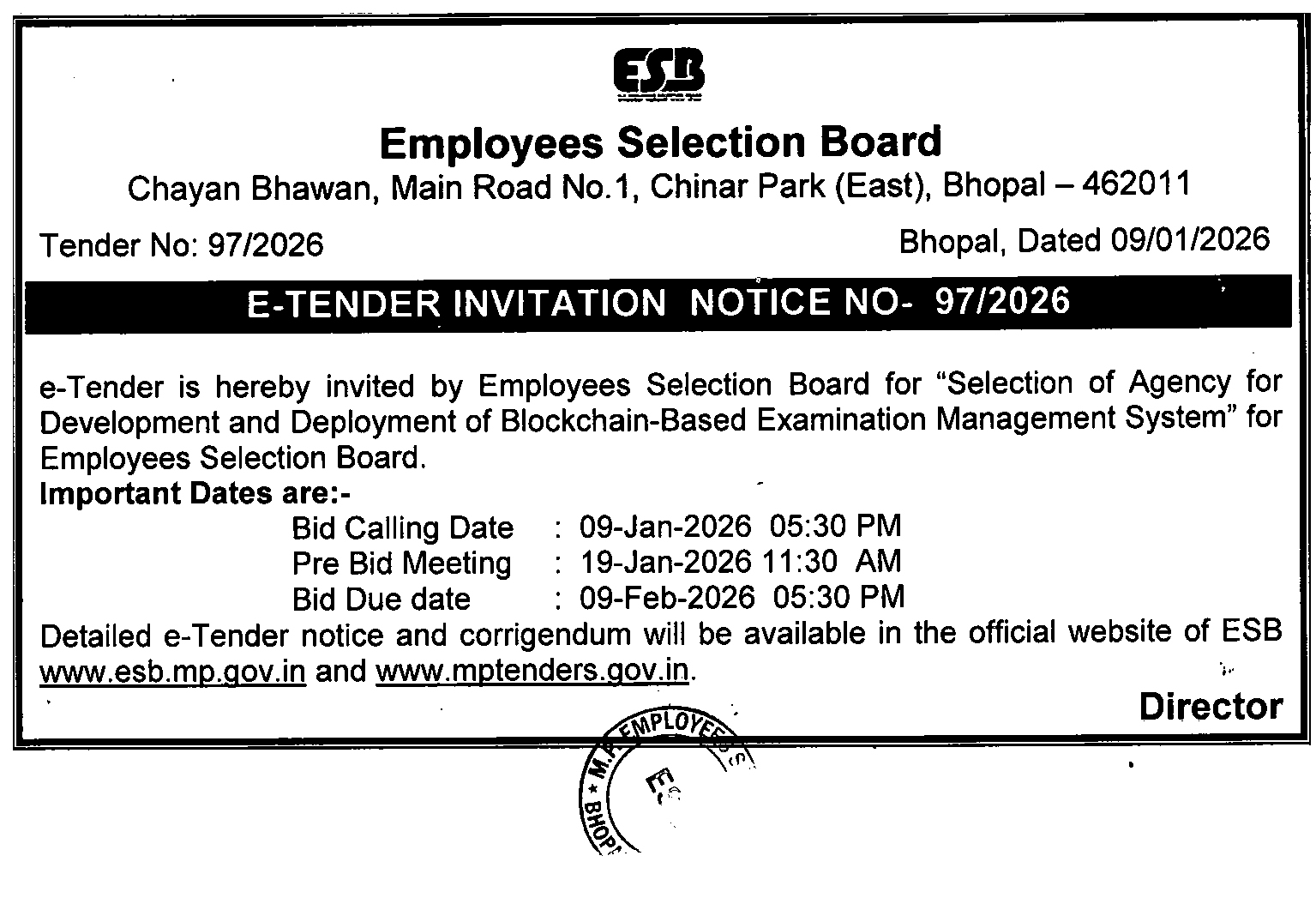 | Document Name | E-Tender - Selection of Agency for Development and Deployment of Blockchain-Based Examination Management System Notice No- 97/2026 | |