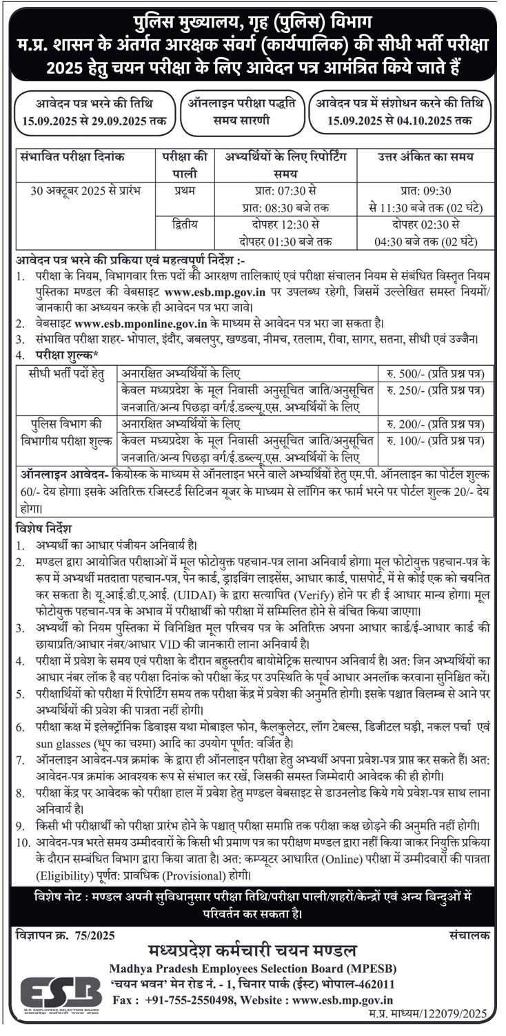 Police Constable Recruitment Test 2023 दिनांक 27/08/2023 को रतलाम शहर के परीक्षा केंद्र में परिवर्तन | Click Here |